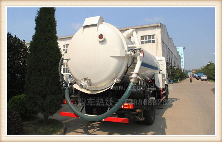 吸污車性能介紹: 組成部分:主要由東風天錦12立方吸污車原裝底盤(全國聯保),真空吸污泵、取力器、傳動軸、水氣分離器、油氣分離器、多路換向閥、罐體、放污閥、視污窗、真空壓力表、管網系統、液壓系統、操作系統等組成。 罐體:使用國標優質5mm碳鋼,罐體封頭一次壓鑄成型、罐體可后開、雙頂自卸,罐內污物可通過后蓋直接傾倒,便于清理罐體內的沉積物、凝固物及對罐體內部進行維修、保養。可選擇使用不銹鋼、鋼襯塑,罐體金屬漆。 液壓系統:由油箱、油泵、多路換向閥、液壓缸、濾油器和管路組成,該系統能實現自卸罐內污物的專用功能。 操作系統:通過操縱多路換向閥的手柄可完成自卸罐內污物工作。(在操作多路換向閥時應掛上取力器帶動油泵工作)。 卸污結構:可通過罐體尾部排污口直接排污,也可打開罐體后門自卸污物,由兩只液壓油缸直接舉升吸污罐進行排污,罐底與地面夾角不小于45度,以實現污物依靠自重能自行卸下。 產品優點:具有抽吸效率高、自吸、自排及自卸等功能。抽滿糞罐時間:≤5分鐘,吸程:≥6米。據有使用壽命長,真空度高(比吸糞車的真空度更高、吸程更遠、壓力更大),工作速度快,操作簡便,運輸方便等特點。安裝進口防溢流裝置,防止糞便、污水因吸滿倒灌至真空泵系統。 產品用途:主要適合用于下水道內的淤積物的抽吸、裝運和排卸,尤其是可 吸下水道泥漿、淤泥、石子、磚塊等較大物體。